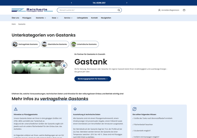 Mit der neuen Shopify-Lösung verfügt Reicherts Flüssiggas nun über eine moderne, klar strukturierte und leicht pflegbare Plattform, auf der alle Inhalte zentral zusammenlaufen.